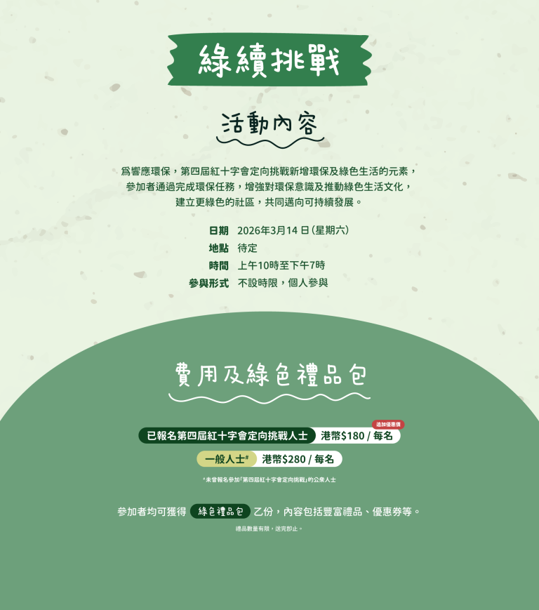 A: 「綠續挑戰」的活動日期及時間為2026年3月14日,上午10時至下午7時,不設活動時限;而「定向挑戰」的活動日期及時間為2026年3月14日至15日其間的任何連續180分鐘內完成。如同時報名兩項活動的參加者,請預留充裕時間分配兩項賽事。因此,本會建議參加者在定向挑戰開始前或結束後進行「綠續挑戰」。